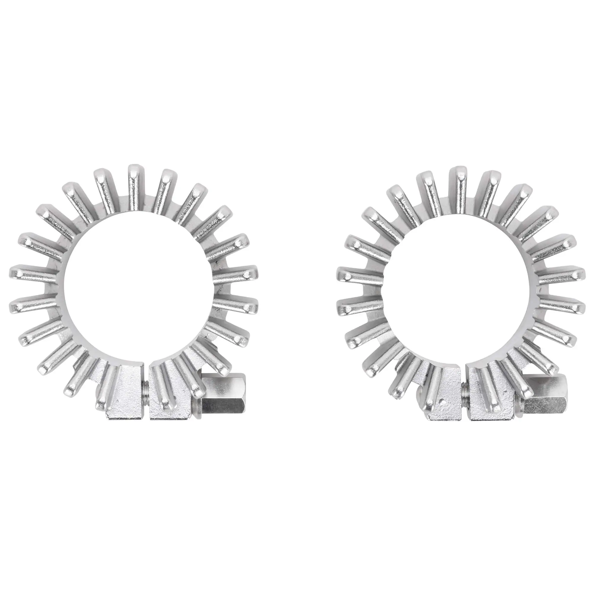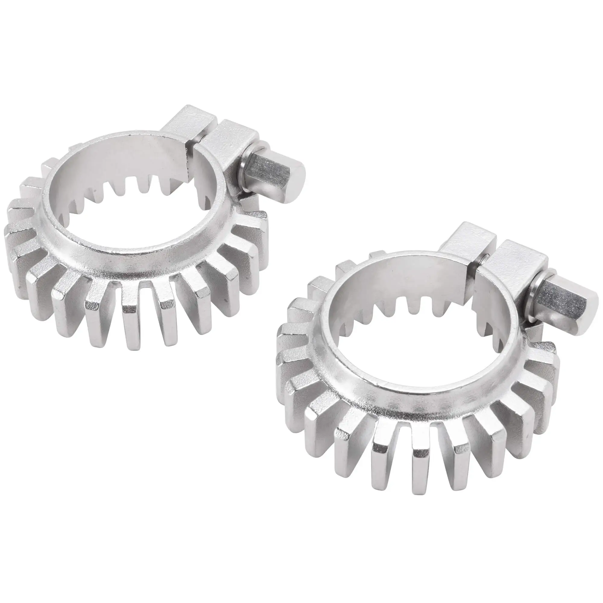 This pair of Triumph exhaust clamps fit Triumph motorcycles with 1-3/4 inch exhaust spigots such as all 650 c.c. pre-unit and unit construction bikes from 1950-1971. These finned exhaust pipe clamps are stainless steel, and include the pinch bolt and washer, ready to install. This is the earlier style with 23 fins, later Triumph exhaust clamps look and fit exactly the same though they only have 17 fins. Sold per pair. Replacement for Triumph OEM # 70-4501
