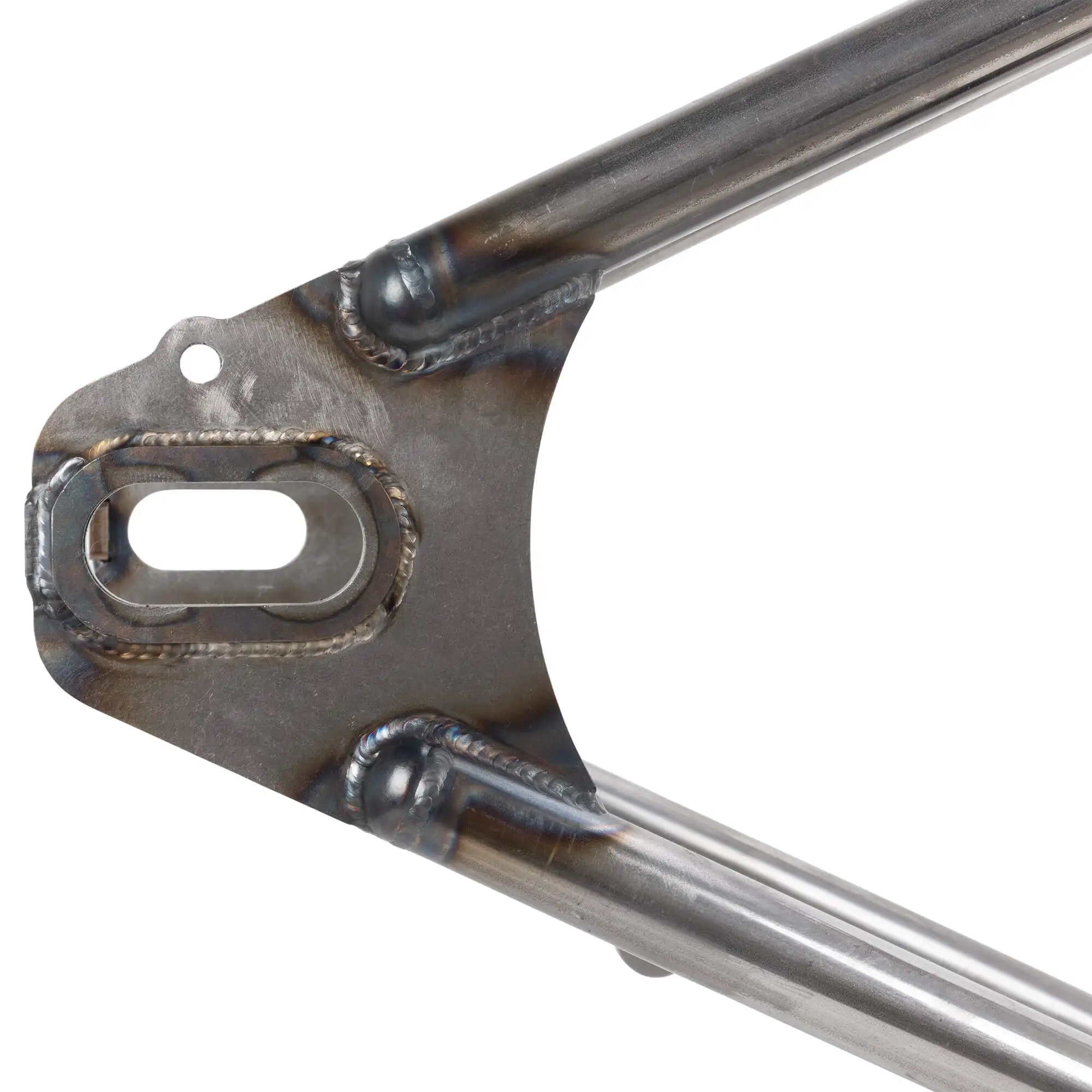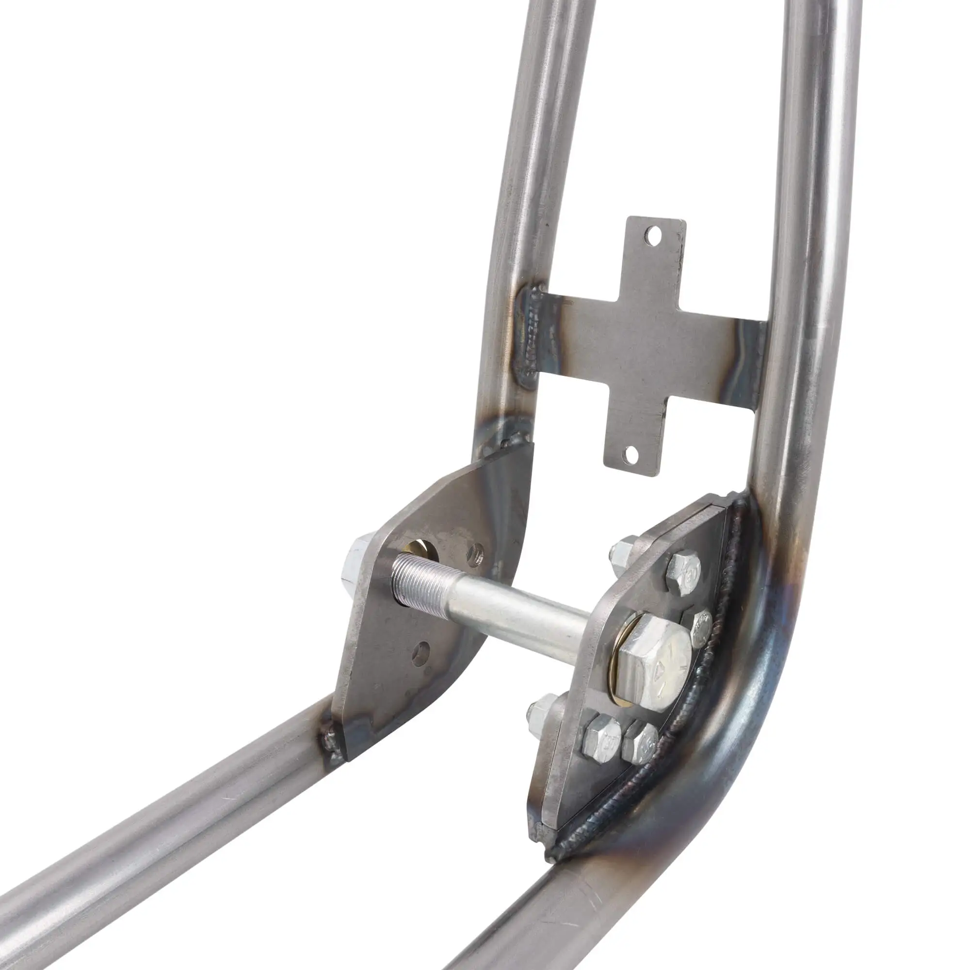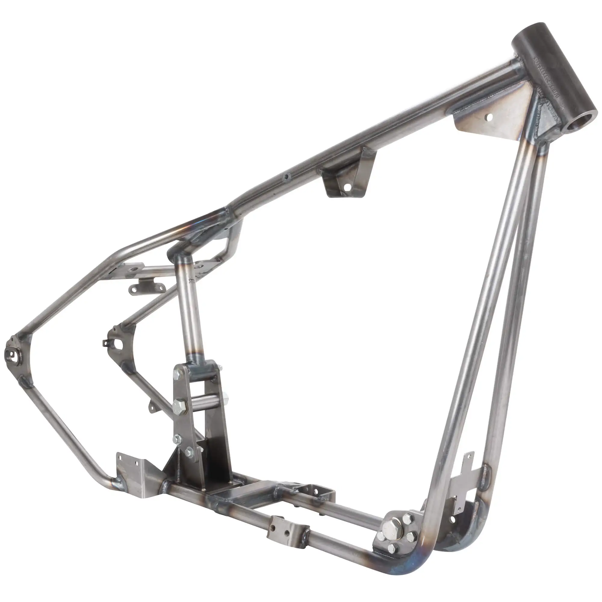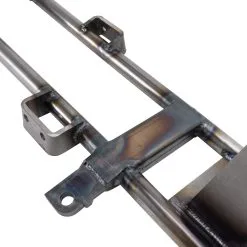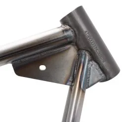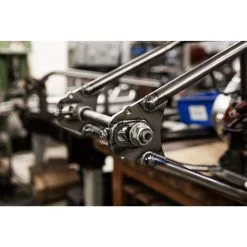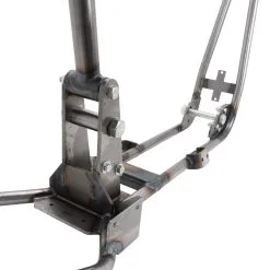 ). The axle plates are set up for stock 1″ or 25mm Sportster rear axles and stock axle adjusters (NOTE: 2004 stock axles measure .75″, you will need to convert to a 1″ axle). The rear brake will require a rigid-type disc brake caliper mount to pivot on the axle with an anchor rod bolted to the frame, as the stock swingarm mounted caliper bracket will not fit. The frame features the brake anchor rod tab fitted and ready to go.