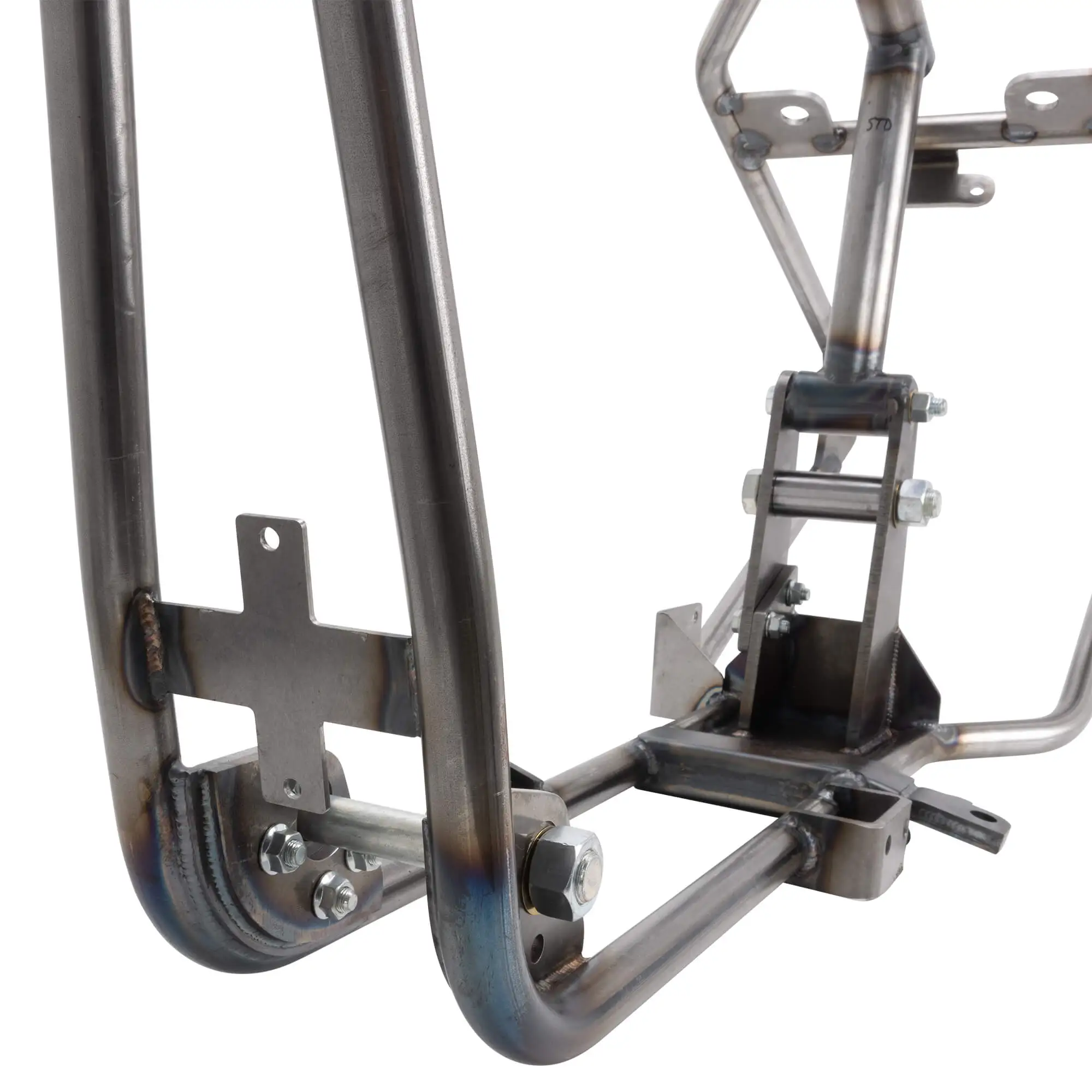 - A rear fender mounting bracket is installed and welded under the seat area.