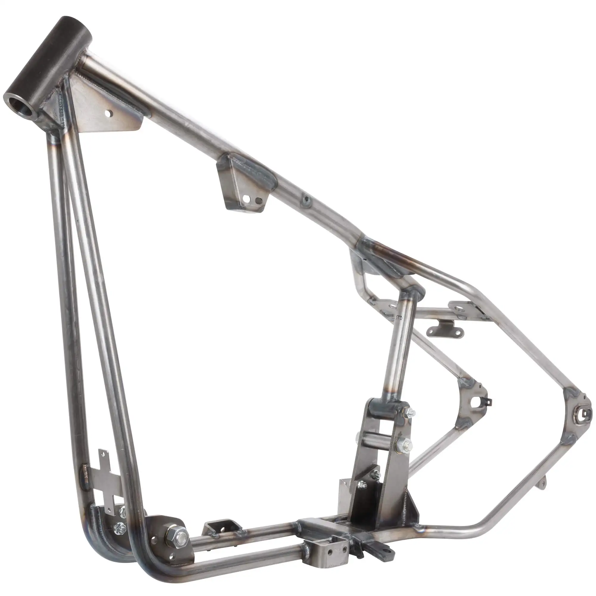 ) is pre-mounted. This will allow either stock Mid footpegs and brake pedal or stock forward mount pegs, with appropriate length brake rod. Front engine mounting plates are pre-drilled for Harley forward footpeg mounts, spacers and bolts not included.
